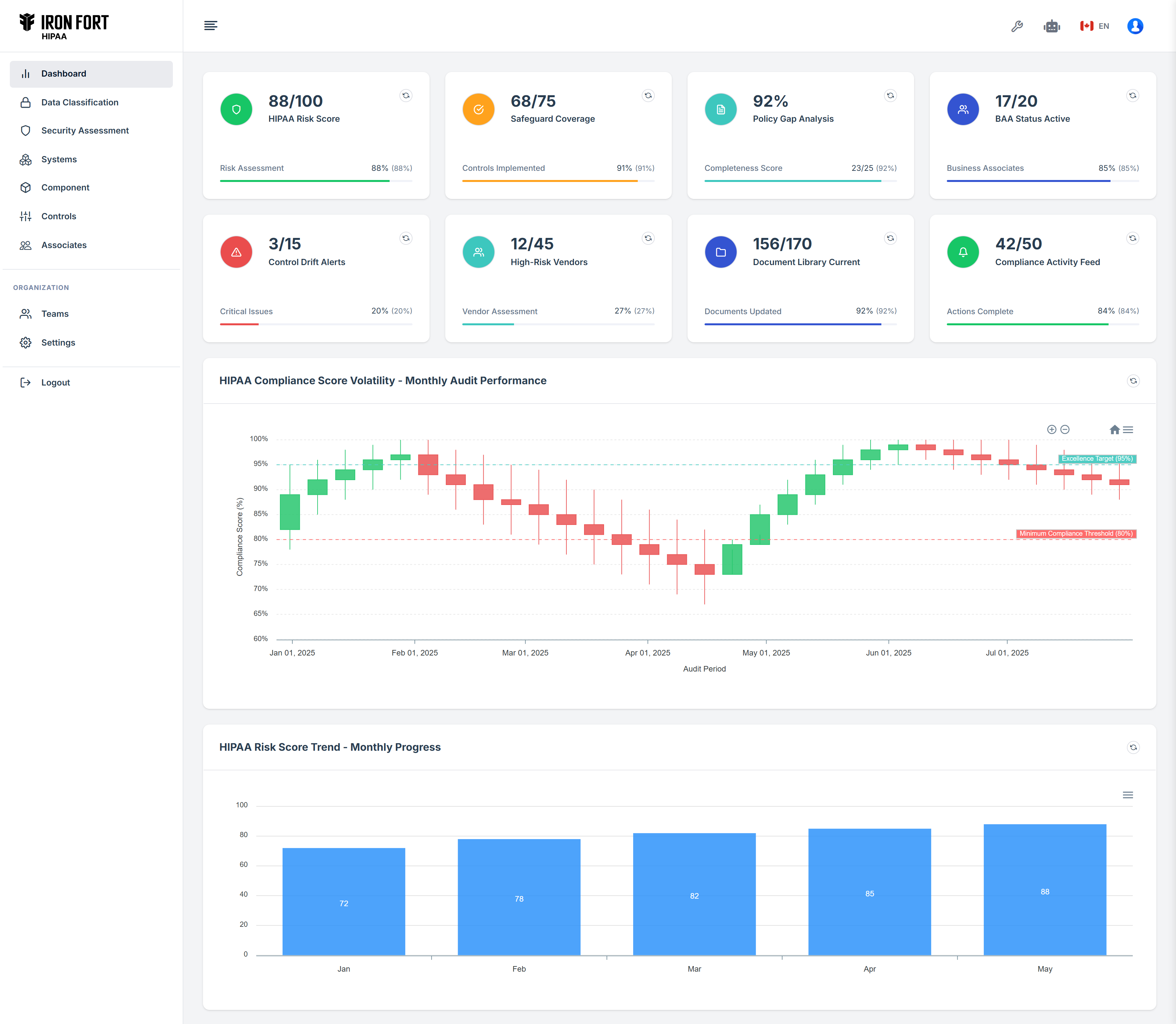 Iron Fort is a cloud-native compliance platform built specifically for HIPAA-covered entities and business associates. We help healthcare organizations automate safeguard monitoring, validate policies and BAAs, and stay continuously prepared for OCR investigations.